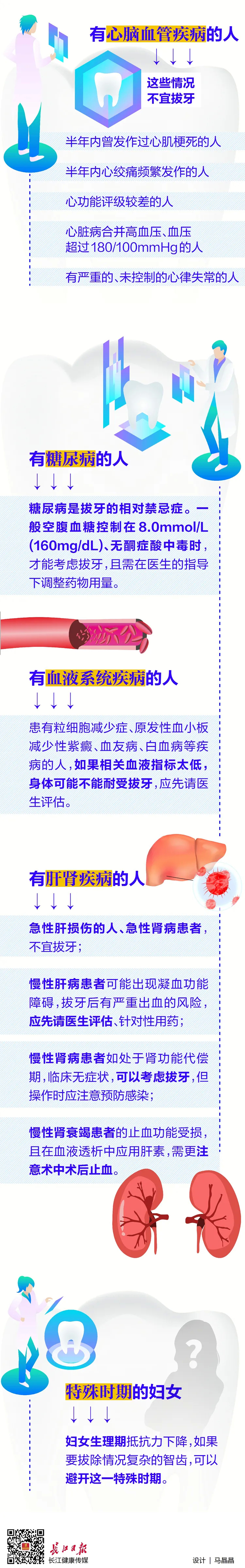 赵吉宏提醒,如果患有心脑血管疾病、糖尿病、血液系统疾病等,一定要到正规医疗机构,咨询专业医生,确定能拔牙后,再找合适的时机拔牙。
