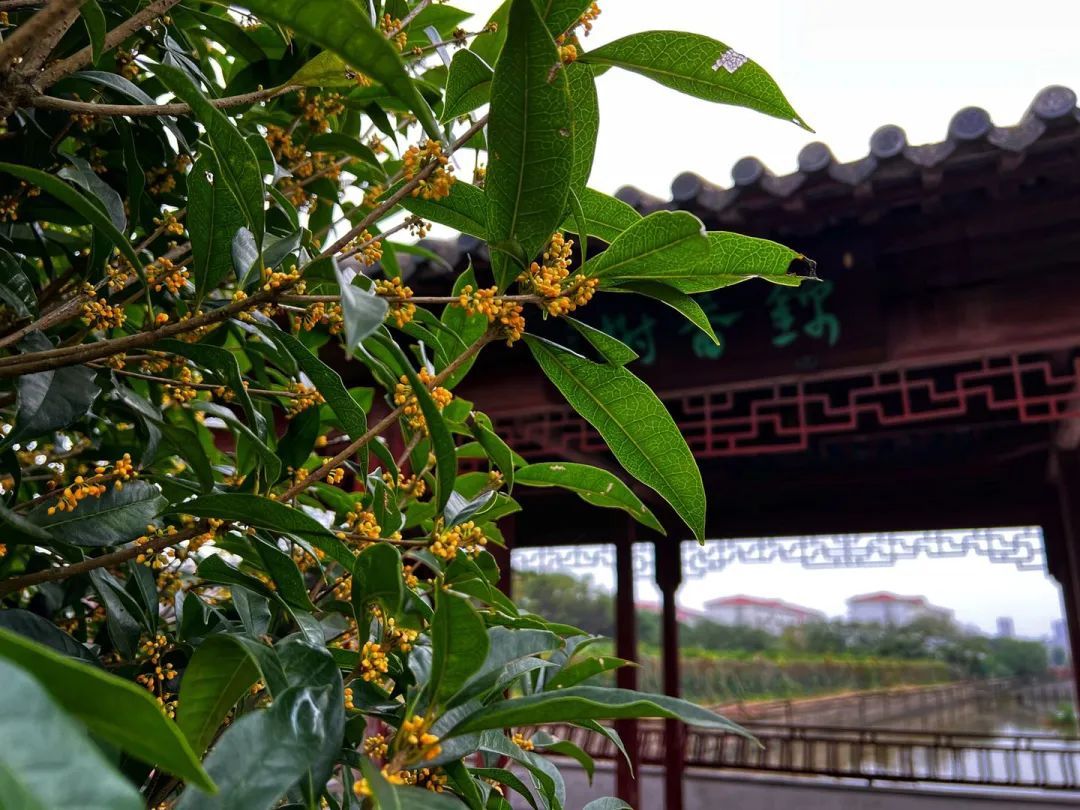 位于环城河畔的紫云廊内,20余棵桂花已陆续开放。随着风吹起,细碎的花瓣不时从枝头掉落,十分好看。紫云廊内的桂花以金桂居多,主要分布在整个外圈,少数银桂集中在南侧。