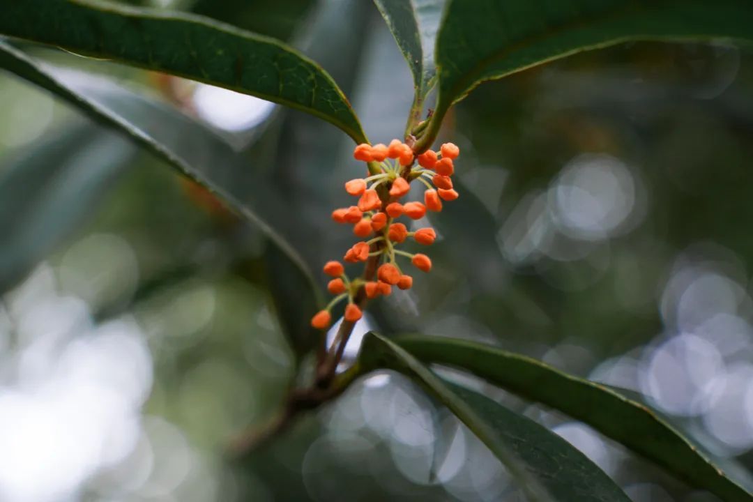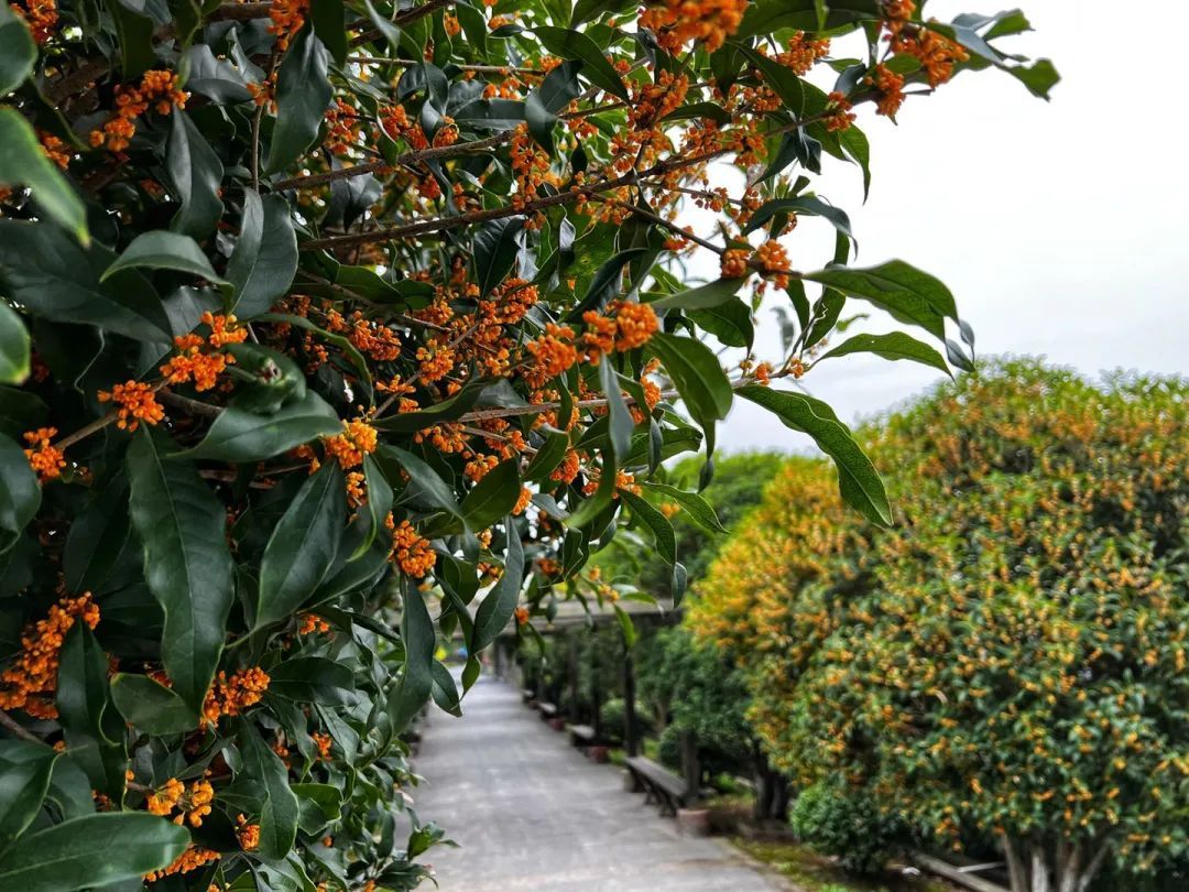 再往公园深处走,沿着主干道数十棵金桂树的桂花已吐露芬芳,其中还有一棵丹桂。丹桂花色橙红,花朵像一粒粒小葡萄聚在一起,香味浓郁,沁人心脾。
