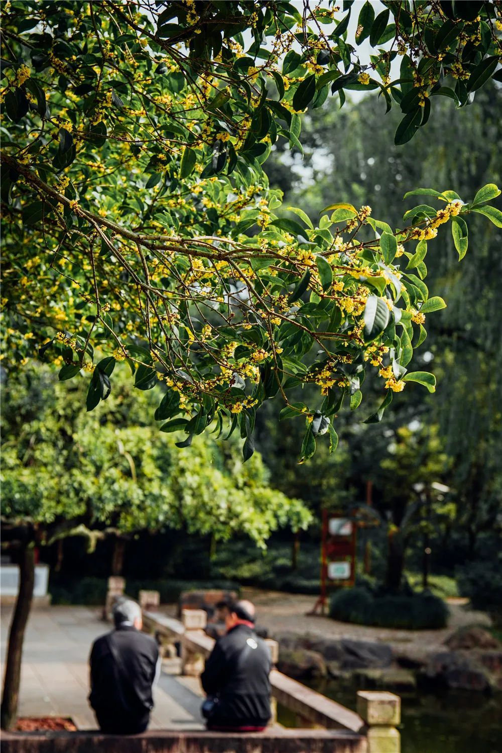 走近复华公园,路上就能闻到阵阵清香。桂花树上的花苞密密匝匝陆续绽放,黄色的花朵为公园增添了一抹亮色。