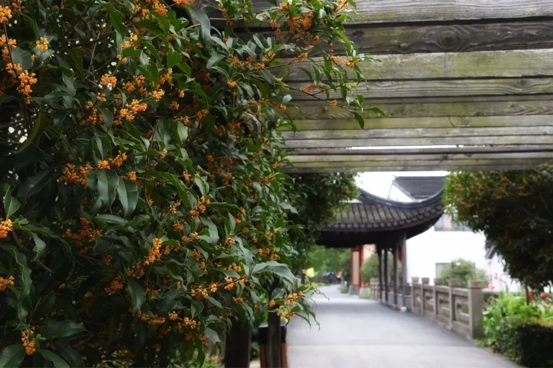 霜竹公路上华亭人家内也已金桂飘香,在园里随便走一走、逛一逛,就能带走一身桂花香。