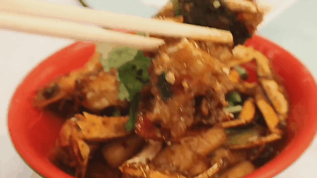 虾蟹金黄酥脆的外皮上,黏裹着香辣的酱料,尝一口外酥里嫩,鲜香四溢。