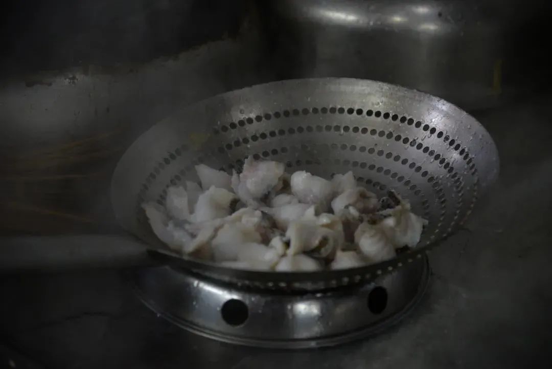 水煮沸后,将酸菜切段放入锅中,加热后捞出,放一边备用。