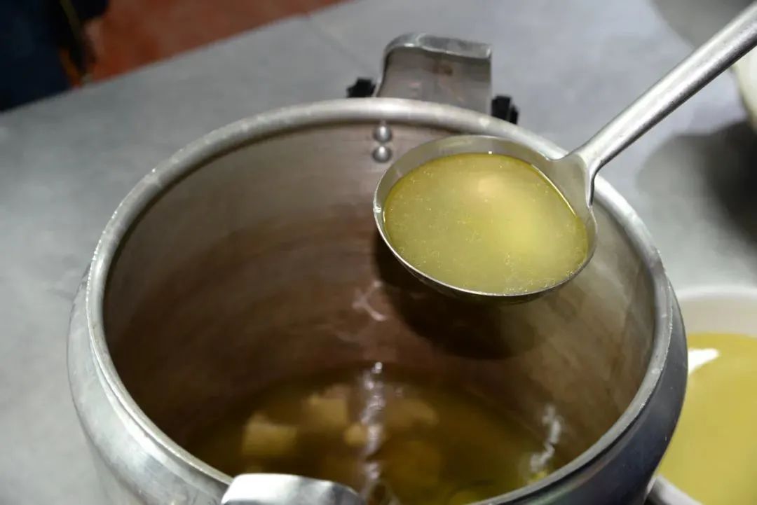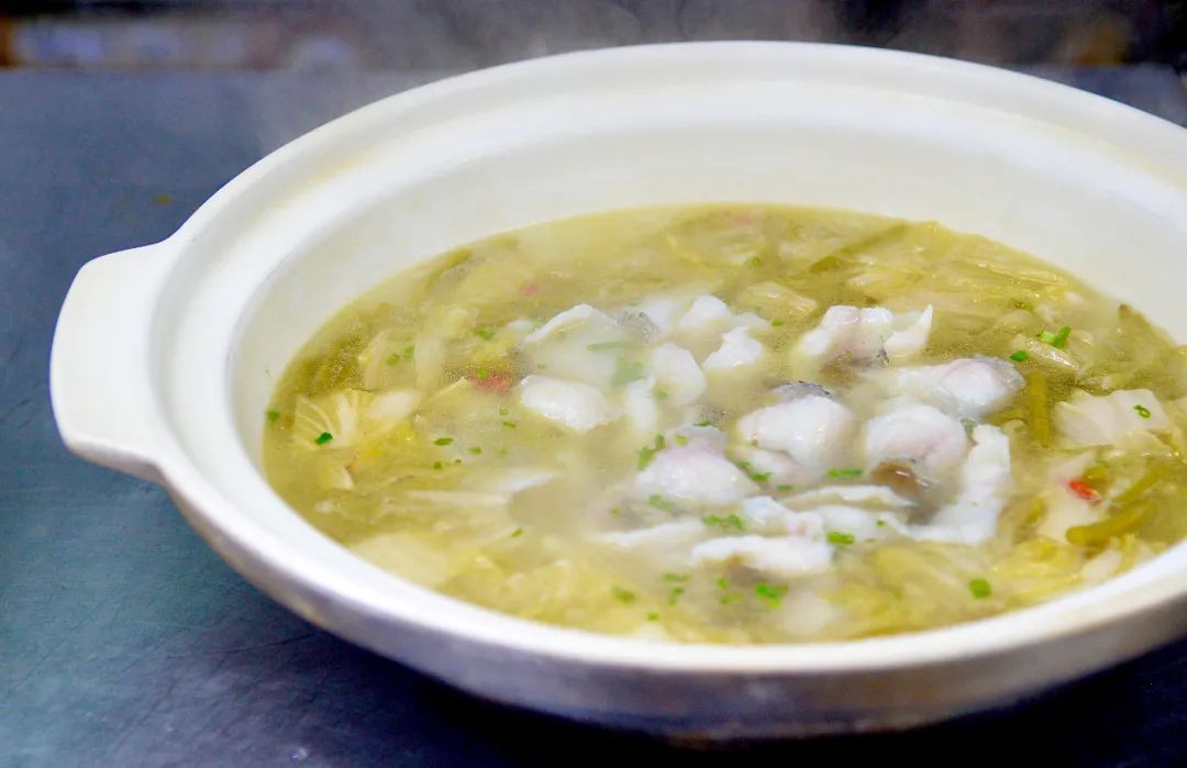 来到沥江生态园的后厨,放在门口的几口大缸引人注目,据厨师李结华介绍,这些缸里腌制的便是制作酸菜鱼用的酸菜。“将大白菜、豇豆、胡萝卜等放入缸中,经过大约45天的腌制、发酵后就可食用了。”李结华说道,“酸菜鱼里的鱼首选3斤左右的黑鱼,只取鱼的中段,这样能保证每一片鱼肉的口感嫩滑。”李结华透露,这道沥江酸菜鱼最大的亮点就是汤底,他选用熬制两个小时的老母鸡汤作为汤底,“吃完一片鱼再喝一口汤,鲜得眉毛掉下来。”