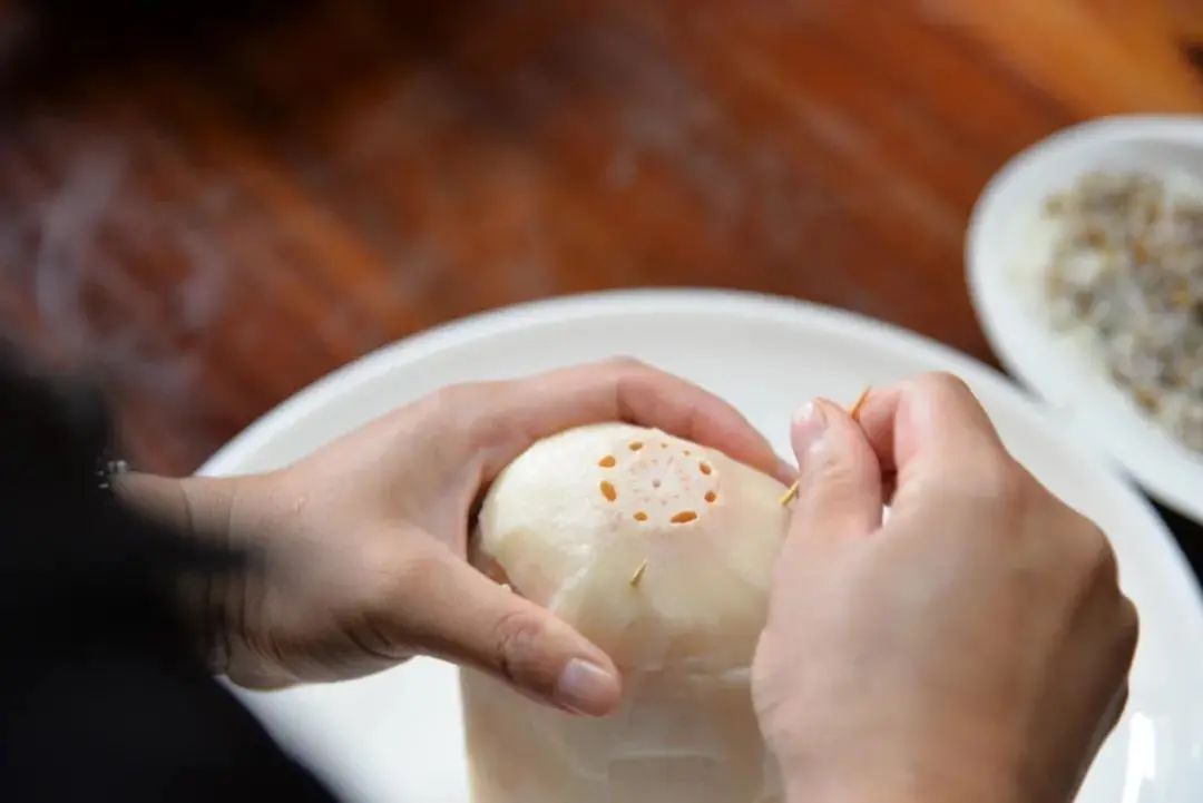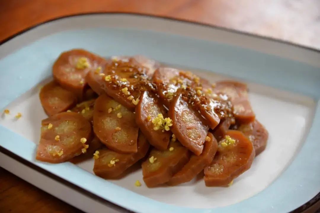 据厨师李丽介绍,制作这道菜需要花2小时左右。制作糖藕用的糖桂花均是嘉朱生态桂花园内栽种的桂花,桂花蜜也是自酿的。这道糖藕最大的特点在于糯米的处理。“我在糯米中加了桂花蜜,这样吃上去桂花的味道会更浓。”李丽提醒说,由于新鲜桂花中含有大量单宁,较为苦涩,需要经过熟化处理后才可食用,一般建议将桂花做成糖桂花或桂花蜜后再食用。