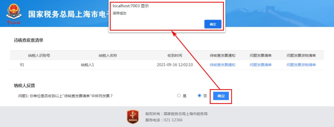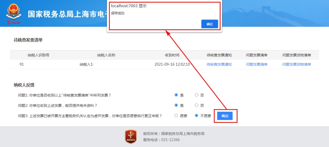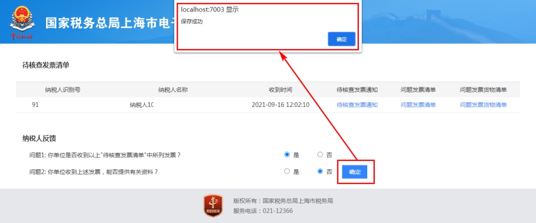 问题2选择【否】时显示【确定】按钮,点击【确定】提示【保存成功】,线上流程结束。