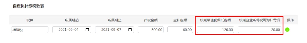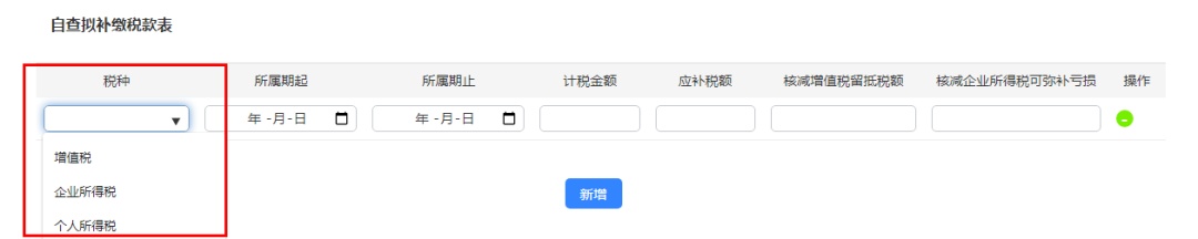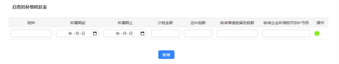 【自查拟补缴税款表】包含:税种、税目、所属期起、所属期止、计税金额、税率、应补税额、核减增值税留抵税额和核减企业所得税可弥补亏损。