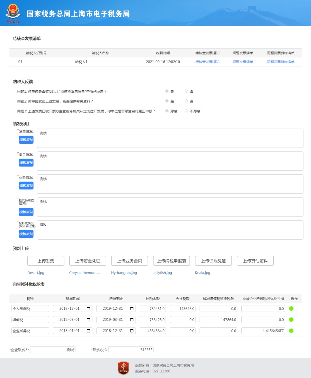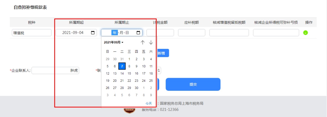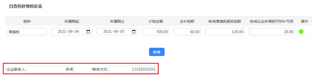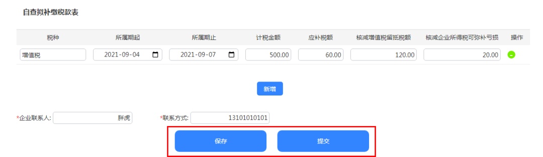 填写完【自查拟补缴税款表】后填写【企业联系人】及【联系方式】(必填)。