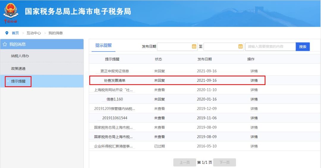 纳税人登录电子税务局后,在下方【更多】-【提示提醒】中能找到协查发票清单的事项,点击右侧【详情】可跳转至【我的待核查发票清单】。