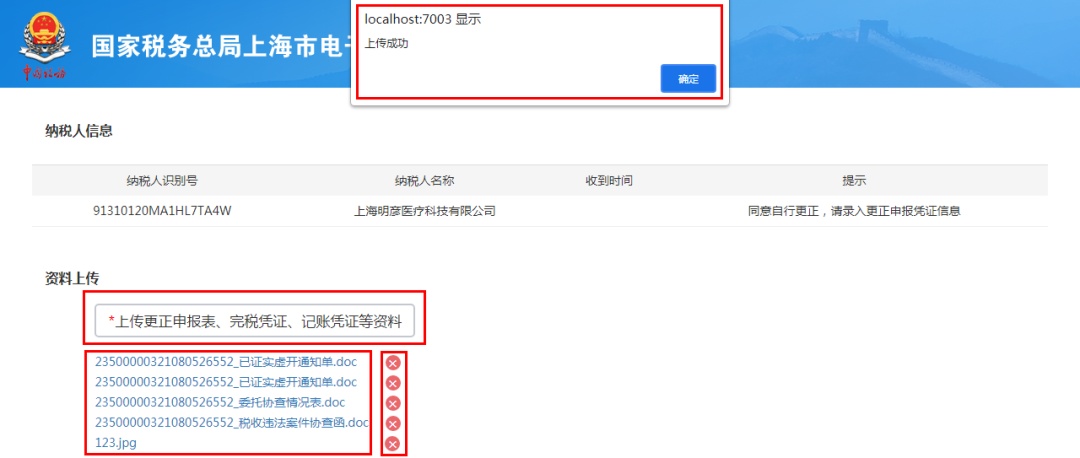 点击【上传更正申报表、完税凭证、记账凭证等资料】可进行文件上传(必须上传):
