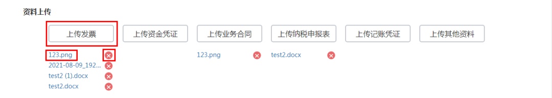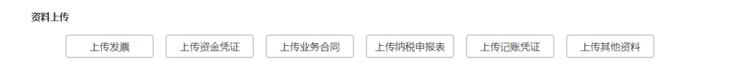 【资料上传】包含:上传发票、上传资金凭证、上传业务合同、上传纳税申报表、上传记账凭证、上传其他资料。