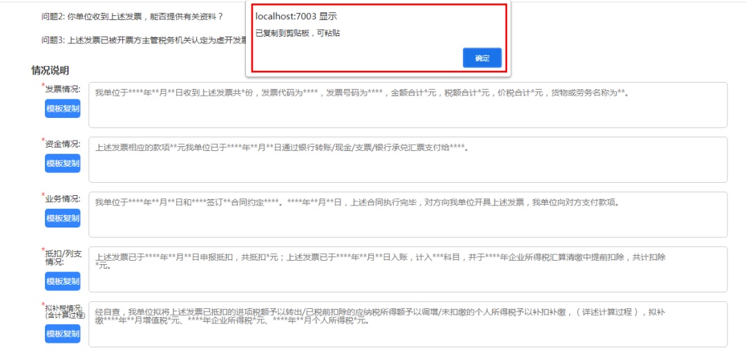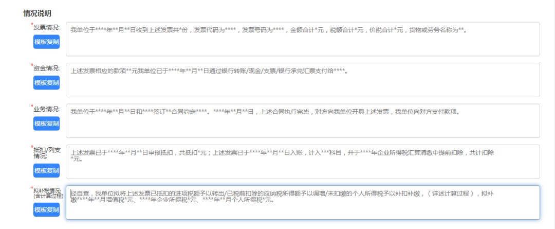 请根据实际情况填写,系统已经事先录入了模板,供纳税人参考借鉴,每项情况可点击【模板复制】按钮,提示【已复制到剪贴板,可粘贴】,将每项情况的模板粘贴后按需填写。