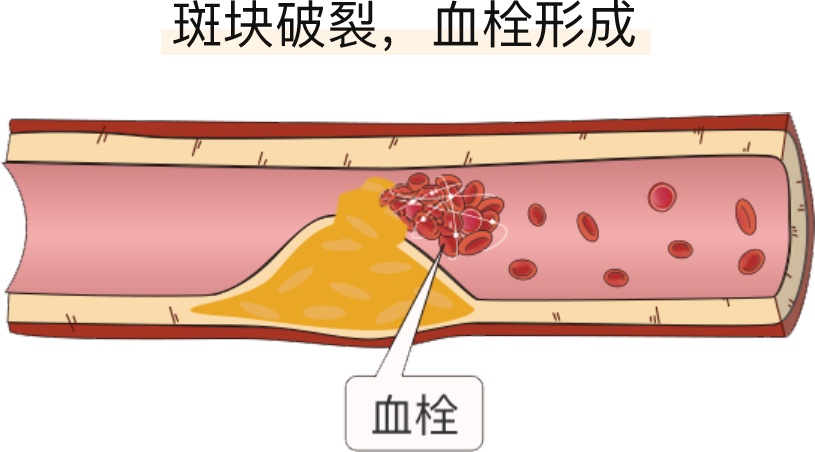 如果斑块不幸发生了破裂或脱落,就会触发凝血形成一个血块,把血管彻底堵死。