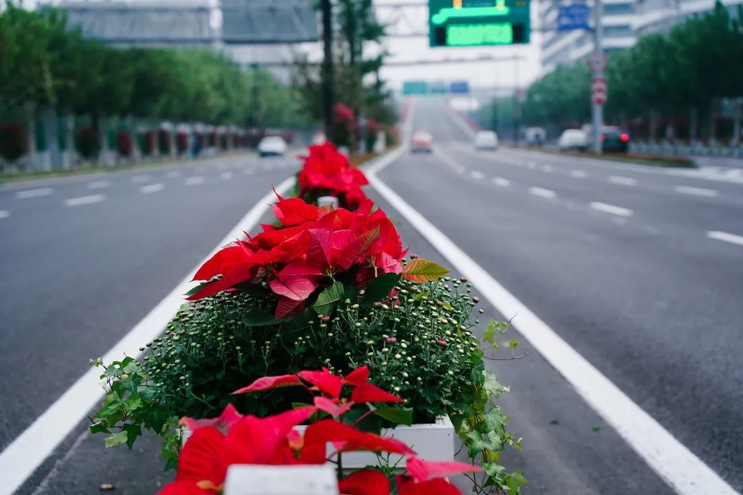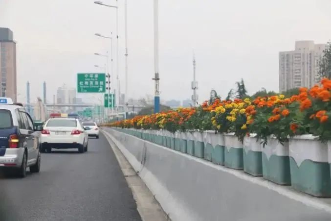 进博会重点保障区域延安高架、延中立交、延西立交、虹桥枢纽南区等路段开展集中换花,近三万盆花被摆放在高架道路护栏上,市民驾车经过仿佛置身于浪漫“花路”。