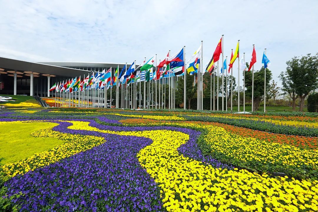 本届进博会花卉景观布置主要位于南广场区域,采用20种花卉苗木,包括角堇、百日草、比格海棠、三角梅、孔雀草、一串红、向日葵等,使用了约96万盆花、4300米长的灯带和1500盏景观灯。