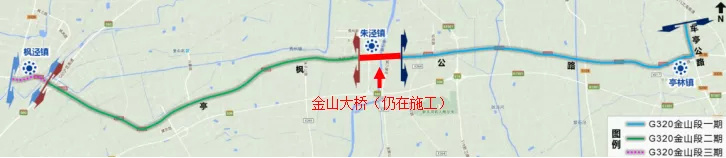 G320公路金山段共分三期工程实施,此次通车段为二期工程,东起金山大桥,西至G60沪昆高速公路,全长14.5公里,车道规模由双向四车道扩建为双向六车道,设计车速60公里/小时。