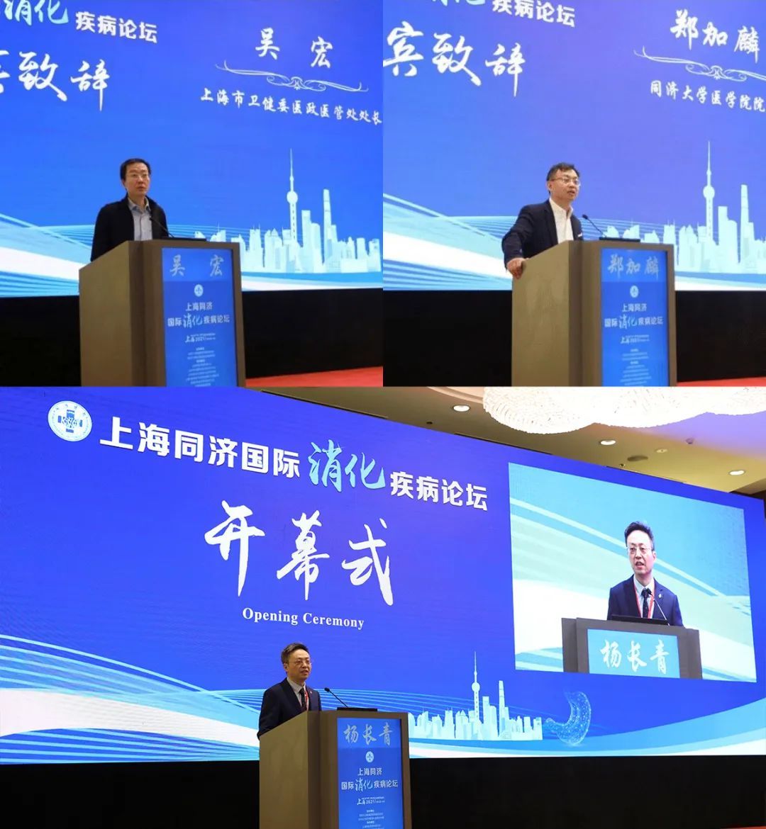论坛开幕式由同济医院大内科主任、消化内科主任杨长青教授主持。杨长青教授在开幕式致辞中引用宋代文学家秦观的名句“金风玉露一相逢,便胜却人间无数”,感谢在疫情未灭、百忙之中能来现场参会的各位领导、嘉宾和参会代表。上海市卫生健康委员会医政医管处吴宏处长、同济大学医学院郑加麟院长先后为论坛致开幕辞。