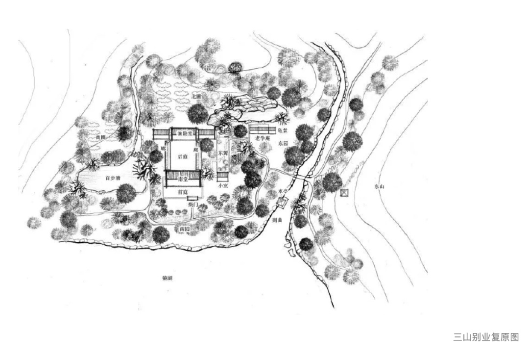 有关三山别业的研究,目前做得最详尽的是邹志方的《陆游研究》中的“三山别业”章节。三山别业在乾道乙酉(1165)开始营建,在乾道丙戌(1166)年入住。陆游在这里生活了四十余年,在《春尽遣怀》等多篇诗词中都有写到。三山别业有十几间房,陆游经常抱怨因人口多而居所不够用,主人老少十余口,加上佣仆,确实不甚宽敞。陆游自己的书房也经常是仅容“一几”或“四人”等情况,几个儿子各自的书房也非常狭小。因此,三山别业作为主要生活起居的场所,严格意义上来讲不是一个园林,但他在宅院东、西、南、北隙地间的造园和营园行为显得特别珍贵且有意趣。