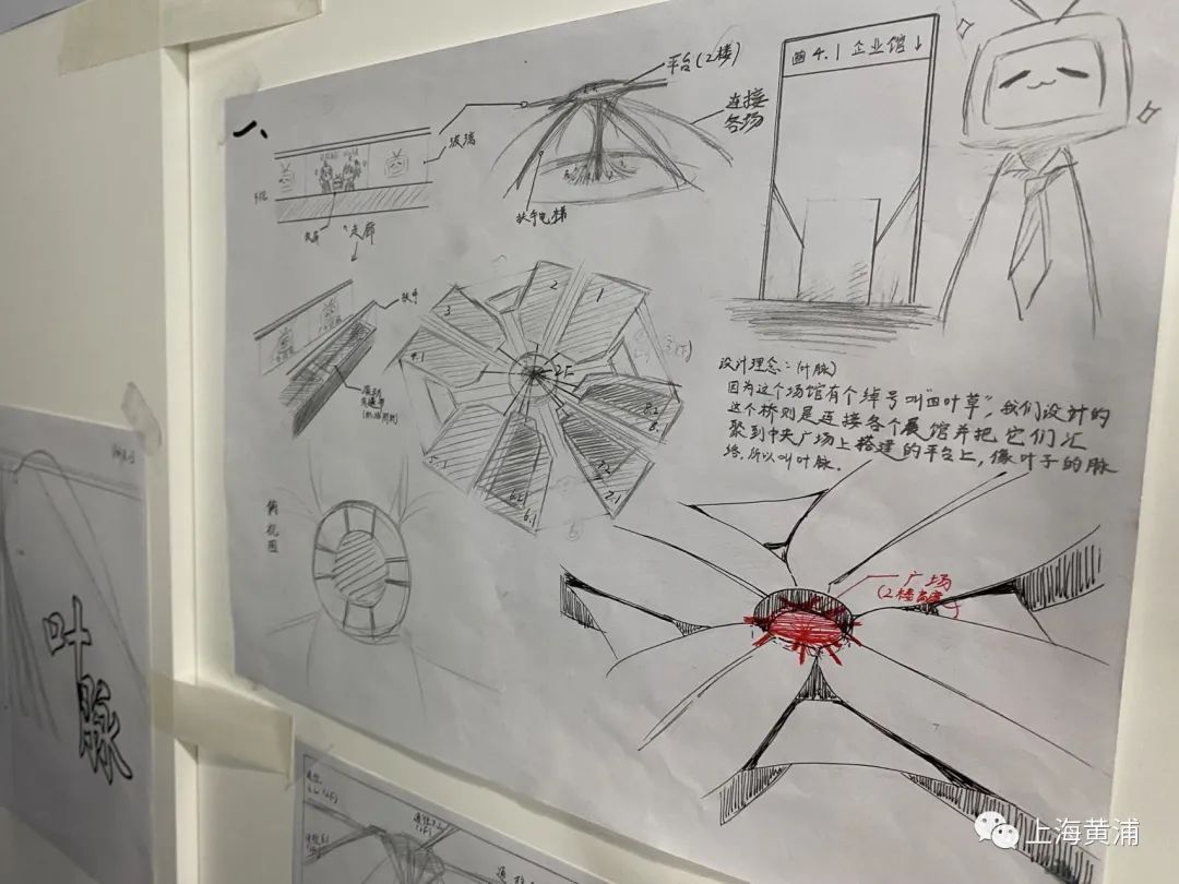 “你的这座桥怎么挡雨?有垂直电梯吗?看上去造价不低嘛!”在项目展示走廊里,几名同学围着女生郑舒匀这一组的桥梁作品“叶脉&叶缘”展开了热烈的讨论。她和伙伴们设计的这座位于上海国家会展中心的桥梁有两层,二楼“叶脉”从中心承重柱延伸出三座梁桥,相互交错,而一楼“叶缘”则将地面的三个展馆相连接,方便游客在会场间穿行。