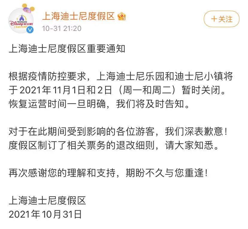 根据疫情防控要求,上海迪士尼乐园和迪士尼小镇将于2021年11月1日和2日(周一和周二)暂时关闭。恢复运营时间一旦明确,将及时告知。