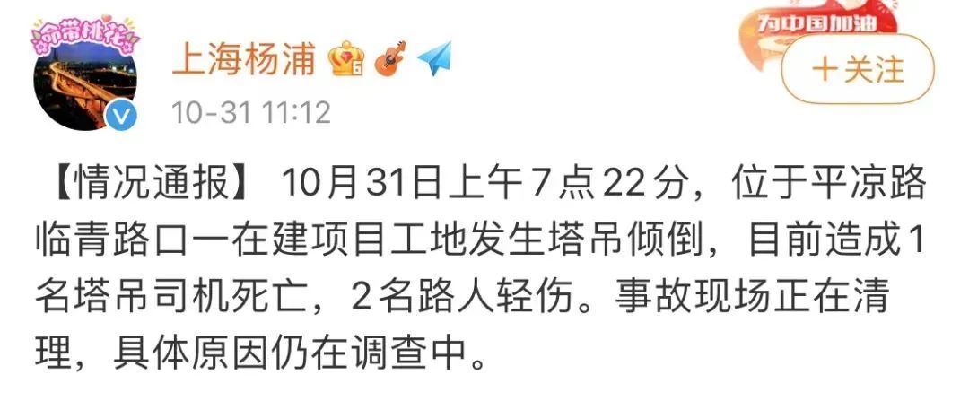 据@上海杨浦通报,昨天(10月31日)上午7时22分,位于平凉路临青路口一在建项目工地发生塔吊倾倒,目前造成1名塔吊司机死亡,2名路人轻伤。事故现场正在清理,具体原因仍在调查中。