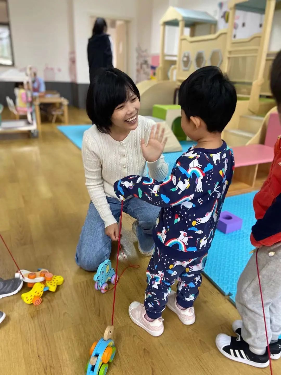 为了保障托班宝宝更好地适应幼儿园生活,托班实施“两教一保”的人员配置。除了日常的学习和游戏活动外,托班老师会更多关注孩子的情绪调节和生活能力的培养。