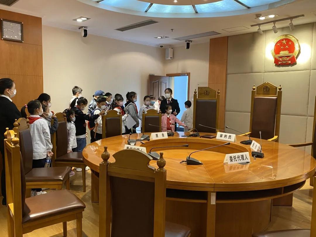 活动中,在法官助理的带领下,学生们来到法院审判楼,现场参观了法庭,并了解了相关的法律知识。在法官助理的指导下,学生们了解案件审理流程,并体验了法庭上的审判长、审判员、人民陪审员、书记员、法警、原告、被告等“角色”。