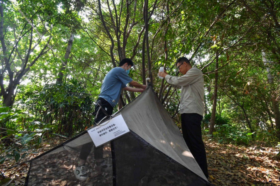 科研人员在海珠湿地查看马氏网采集到的昆虫样本(10月26日摄)。