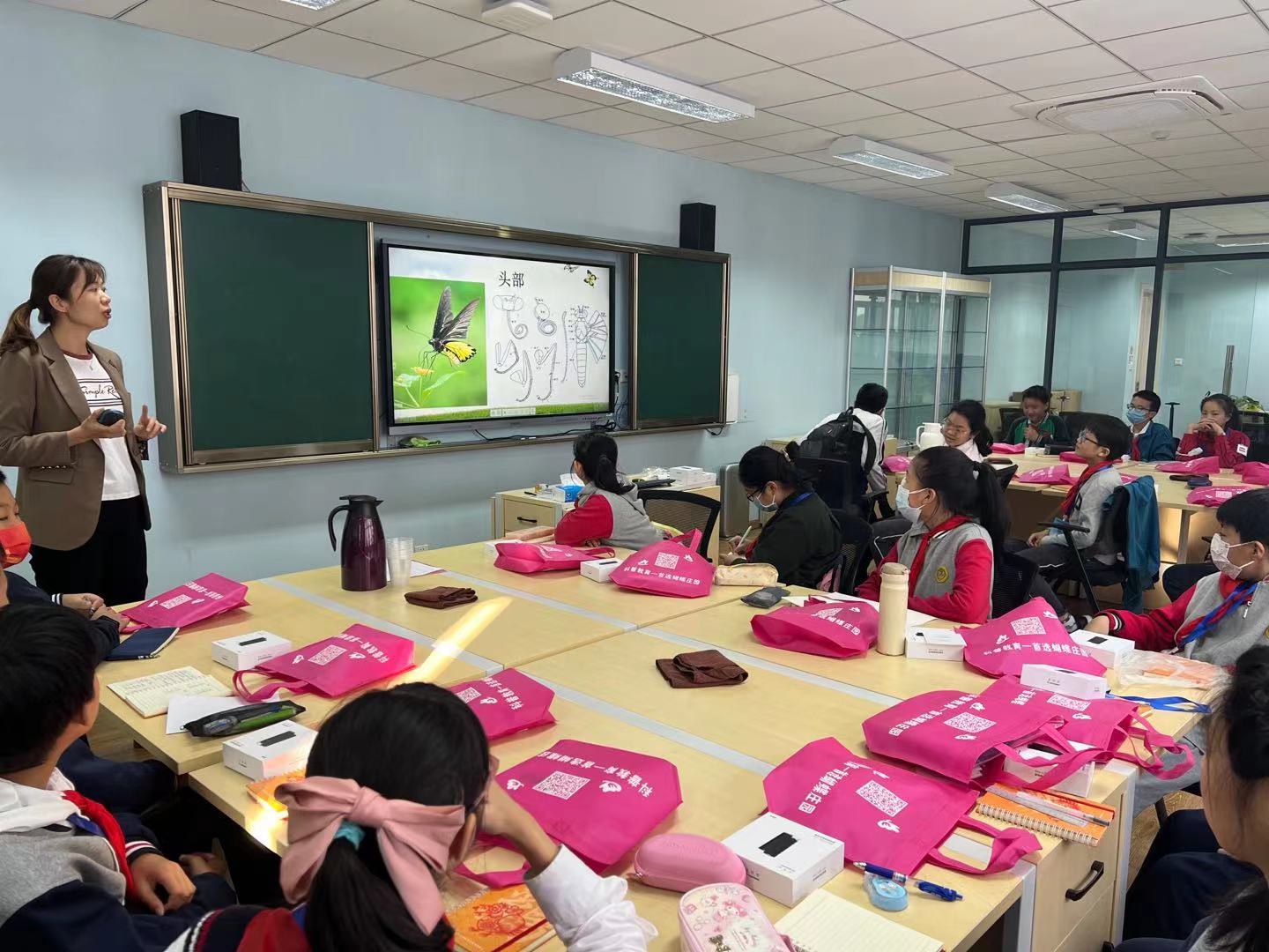 “创意思维室”里“生物环境社团”的学生们正在学习蝴蝶的身体构造、蝴蝶的生长发育过程等,通过对人工饲养的大紫蛱蝶贴翅标本的创作,培养孩子们观察能力、提高动手实践能力的同时,引导大家积极地关注自己身边的生物与环境问题。