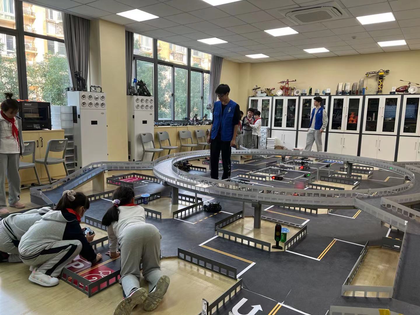 “人工智能室”里,以时下热门的无人驾驶为背景,同学们自制一辆辆循迹和无人驾驶小车在光电和视觉传感器的辅助下,正在进行竞速比赛,激发孩子们学习的兴趣,课堂氛围活跃。