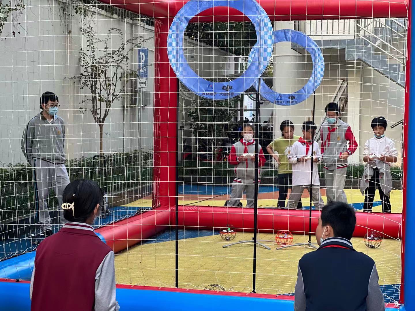 操场上,由于进博会期间的“禁飞令”,无人机社团选择了在封闭场地内开展的竞技项目“无人机足球”进行展示。3v3的无人机足球赛,考验的不仅仅是同学们的操纵技能,更注重培养团队协作意识和临场应变能力。