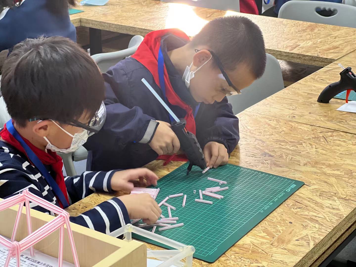 “创想匠造室”正在进行的是根据上海未来工程师大赛中的经典项目——轻量座椅进行的延伸拓展,学生们利用随处可见的吸管搭建形如八仙桌的结构造型并进行现场承重测试,有限的时间里考验着学生们的耐心和细心。
