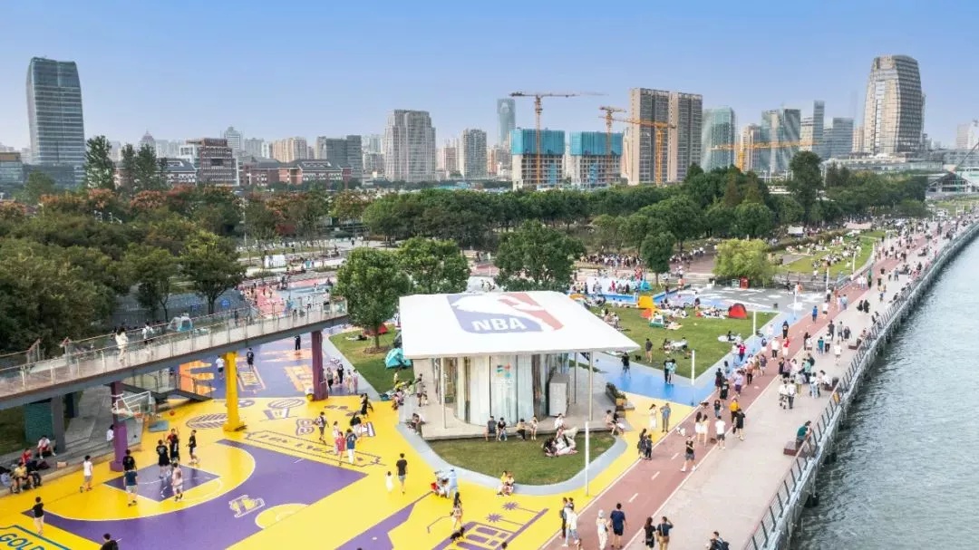 主题形象升级、空间优化改造后的滑板公园,总面积4800平方米,由NBA主题篮球场、NBA艺术主题下沉滑板广场两个区域组成。