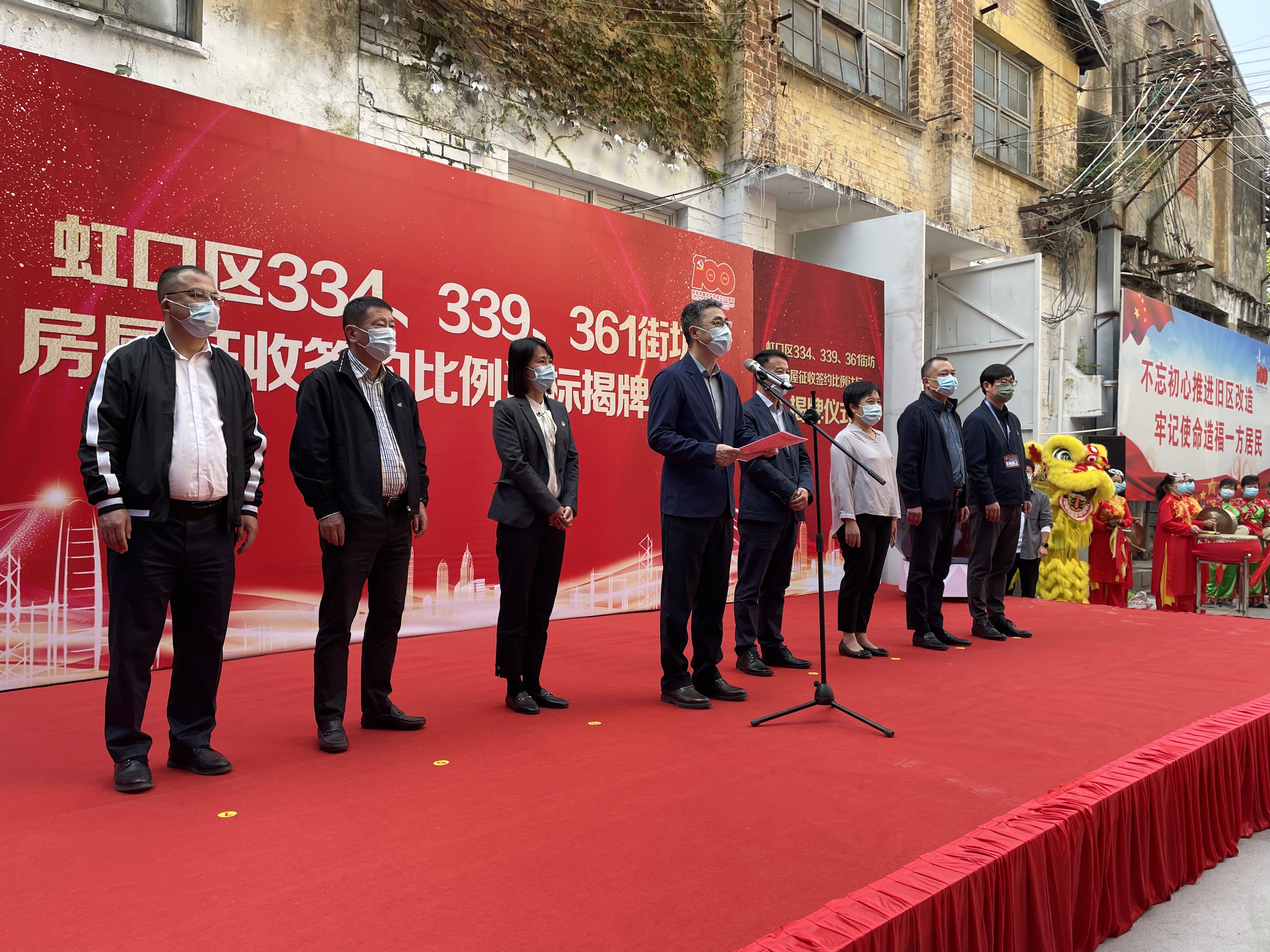 在生效仪式现场,虹口区委常委、副区长关也彤宣布:“截至2021年11月1日14点,334、339、361街坊第二轮方案征询居民签约391证,居民签约率达到99.23%,房屋征收成功!”居民们欢欣鼓舞,说到动情处更是哽咽落泪。