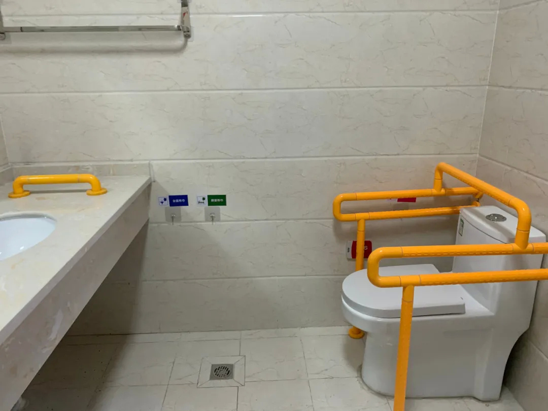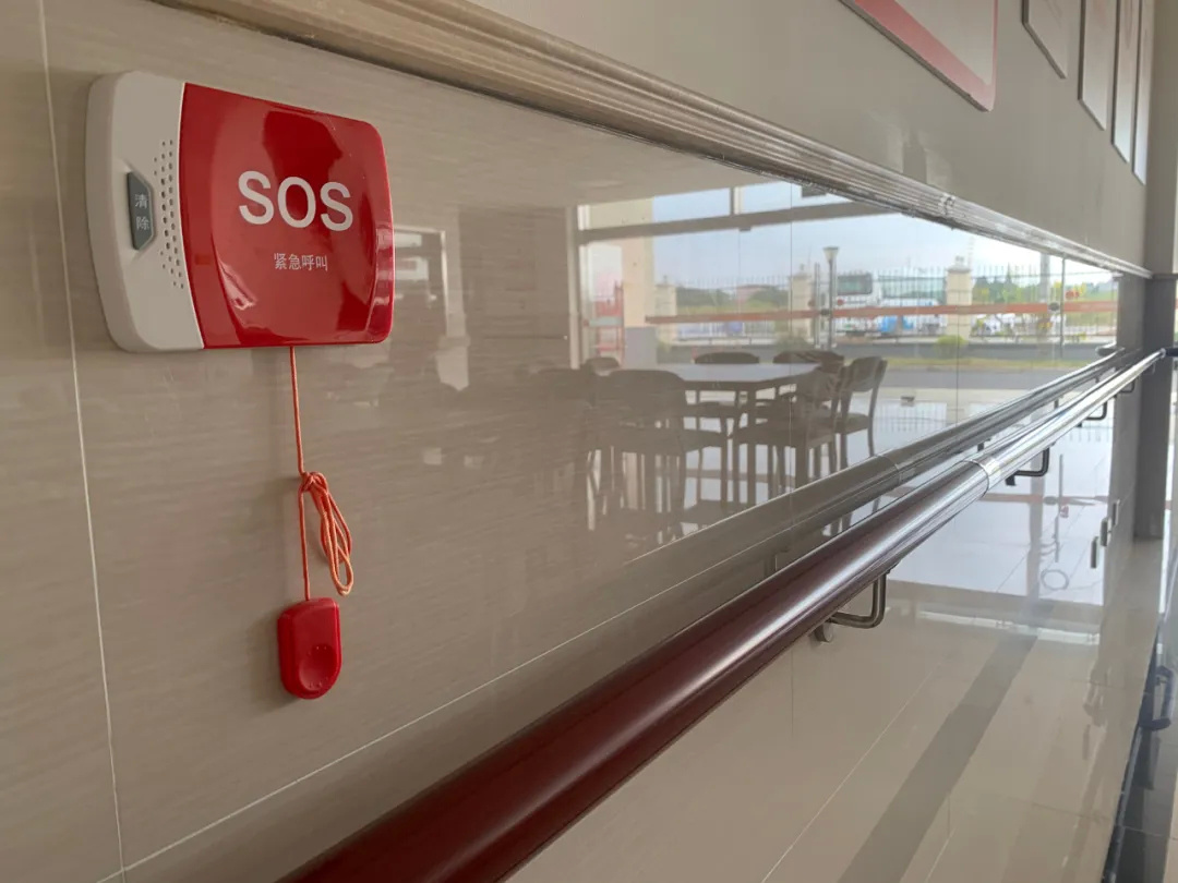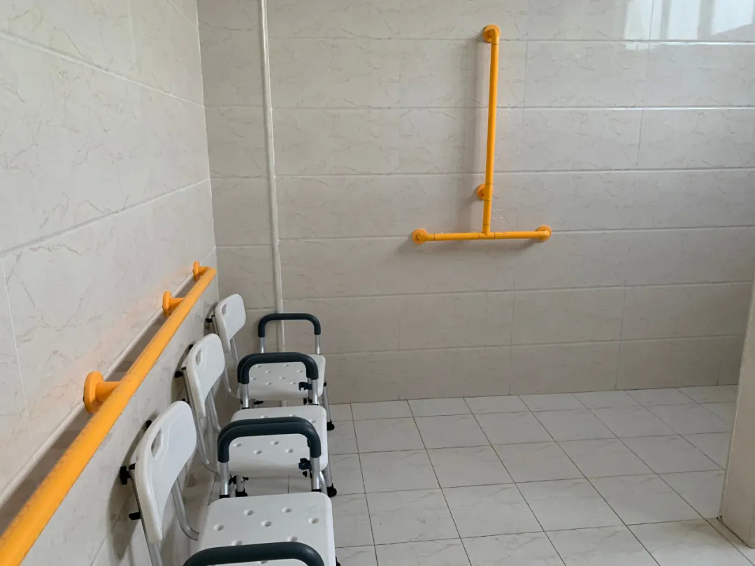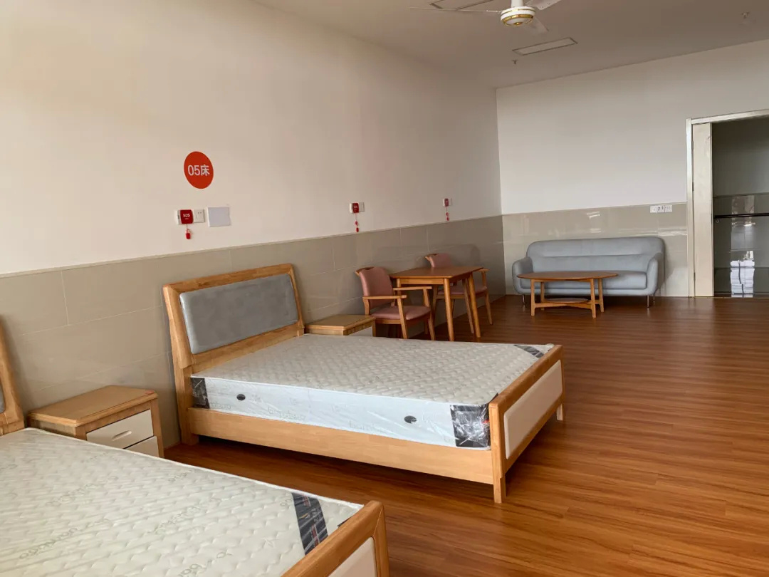 考虑到老人的安全问题,房间里除了有空调、衣橱等基础设施外,还统一使用了多功能护理床。淋浴室、走道、餐厅等公共区域也都装有求助呼叫系统、扶手等适老性设备,并安排了护理员提供24小时服务。