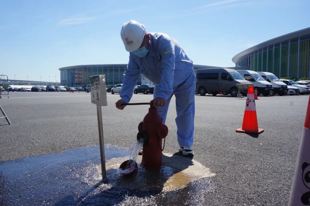 集团按照“两路水源、三家水厂、四座泵站、八路进水”的布局开展供水保障,在国展中心以北3公里处设置供水前线保障指挥部,确保15分钟内到达国展中心现场。今年,供水服务重点保障范围将拓展至包含国展中心在内的虹桥商务区部分核心区域,该区域内已实现消火栓报警装置监控、AR阀门巡检系统全覆盖,并新增在线水质监测点、噪音监听设备。此外,今年还新增了国展中心泵房管理工作,对国展中心水泵房二次供水软硬件进行改造升级,进一步提高展馆内的饮用水品质。徐泾、泰和水厂深度处理系统的投产,以及二氧化碳投加系统在徐泾水厂的应用,更是大幅提升了进博区域供水水质和水厂抵御风险能级。