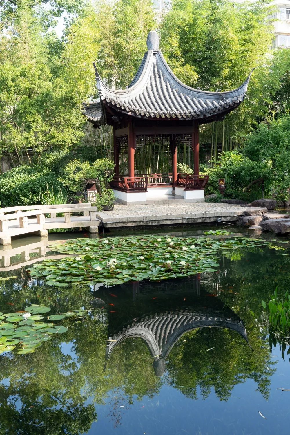 站在翠猗桥上俯瞰,这座凉亭攒尖宝顶装饰,四个翘角弧度流畅,亭子下部是四根深红色彩的木柱,亭台相间,古色古香,清幽雅致。
