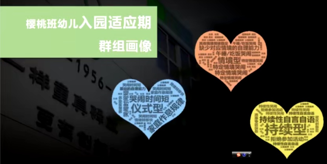 组群画像显示,班级幼儿大致分为三种类型——仪式型:跟爸爸妈妈分离的时候哭得撕心裂肺,但爸爸妈妈离开后马上能开心地去玩;情境型:可能会在某一个情境下出现情绪,比如不能自己吃饭的小朋友,在吃饭的时候就会哭;持续型:拒绝参加课程活动的,甚至伴有自言自语。