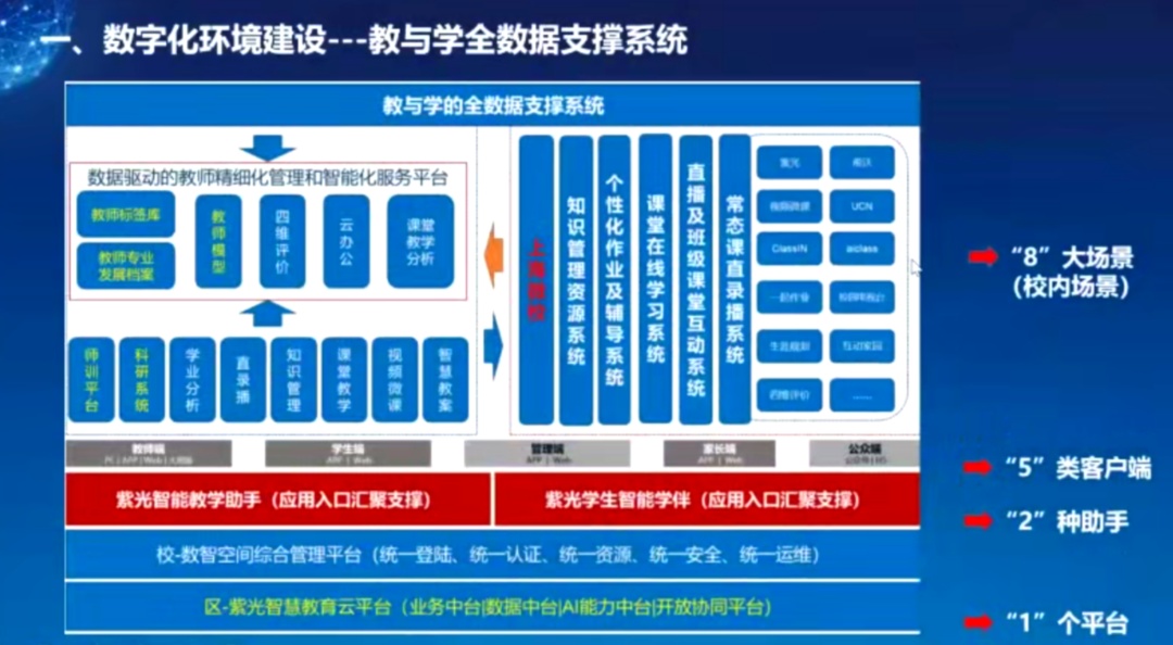 在华东理工大学附属闵行科技高级中学,依托信息化技术,学校搭建了教与学的全数据支撑系统,包括一个平台、两个助手、5类客户端、8大场景,匹配智慧教室、创新实验室、未来教室以及教师行为采集,全程自动课堂教学、录播、系统等。