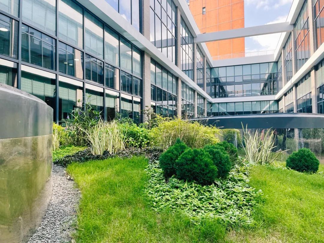 改造后的中庭成为一个简约现代、灵动明快的自然花园,是自然学习、生态美育的展示场所,也是彰显文化、生态内涵的特色标志。设计以“思源水长”作为主题,通过微地形营造曲折变化、生动有趣的空间体验,不同高差增加了植物生长的厚度,弱化采光井高度的同时也增加了空间的纵深与层次感,将艺术性、趣味性、文化意向、场所特质融于一体,步道蜿蜒穿行,空间幽雅静谧。植物配置上选用较低维护、四季常绿为主、耐寒耐旱的植物品种,适当配以时令草花点缀,既有自然之生趣,亦有花草之芬芳,大大提高屋顶景观的可持续性。
