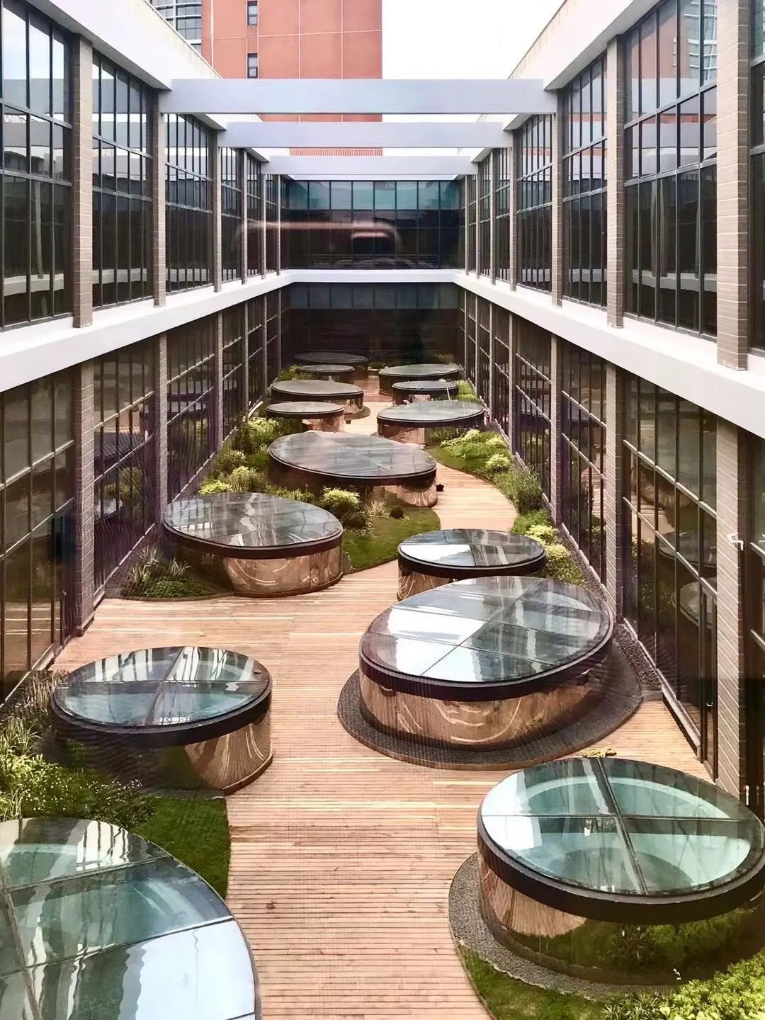 在新图的三楼,有一个两层高的中庭,中庭内散落着十多个大大小小名为“智慧之眼”的采光井。原本这里是单侧采光,北侧室内大片落地玻璃旁放有桌椅,可供师生在此阅读学习;中庭南侧设置了大幅莫奈睡莲主题画,烘托静谧氛围的同时却也让南侧走廊变得幽暗而封闭。本次改造拆除了已日渐锈蚀的装饰画,打开原本闭塞的中庭空间,恢复屋顶绿化的功能,打造可步入、可赏景、可休憩的空中花园。