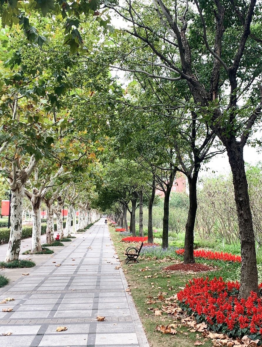 宣怀大道是闵行校区东西向的景观主轴,深秋季节的悬铃木大道,是一道金色的风景线。本次景观提升以花境点缀的方式,丰富了该区域在秋季的可观赏性。
