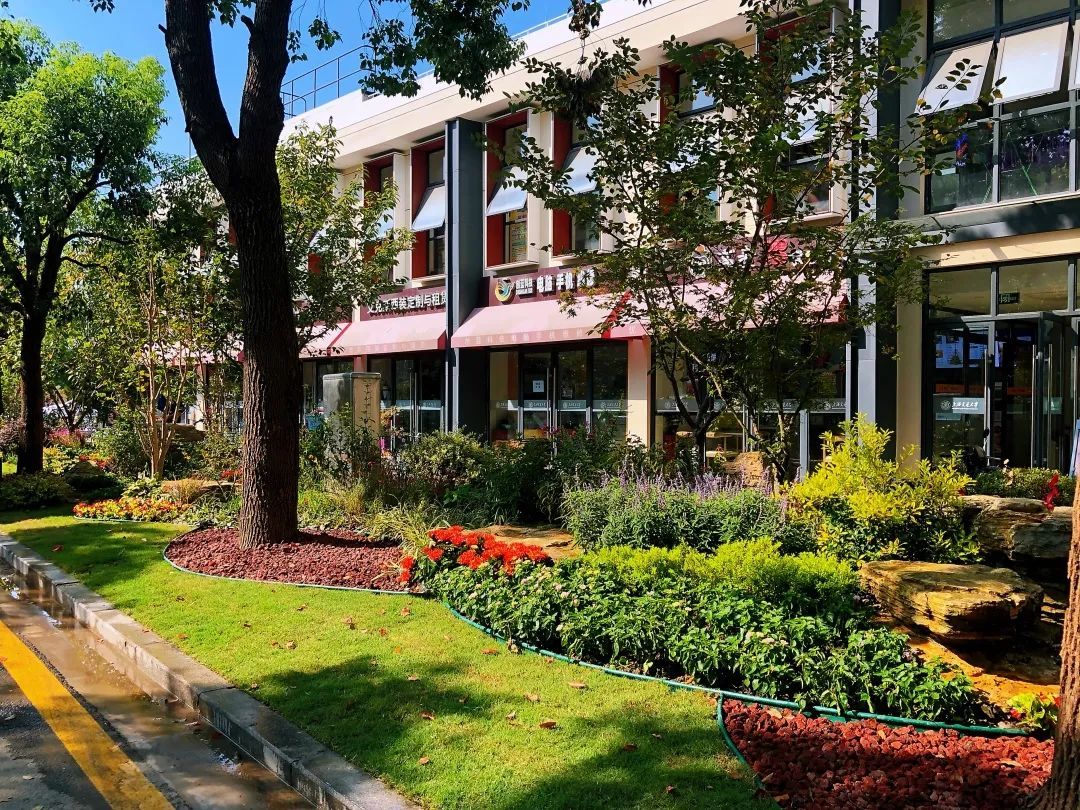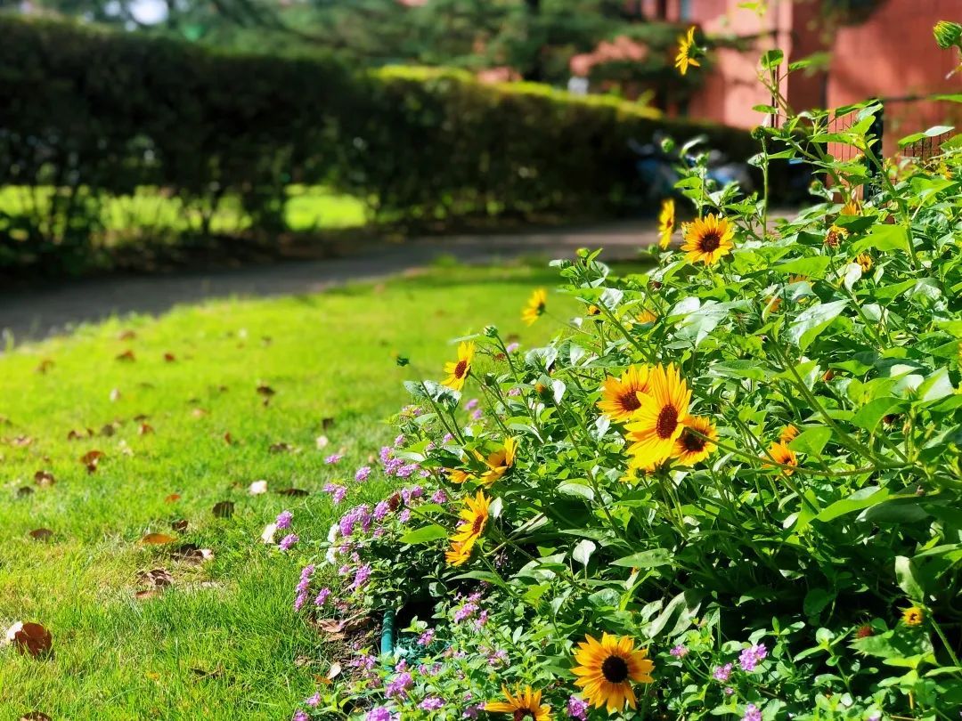 西区教学楼的东侧、东区教学楼的西侧绿地也分别进行了景观改造,将小型灌木和宿根、球根、草本花卉以组丛状布置,模拟自然界中林地边缘地带多种野生花卉交错生长状态,小中见大,静中有趣,高低错落,一个个“小而美”的路缘花境成为校园“慢行区”的最美注脚。