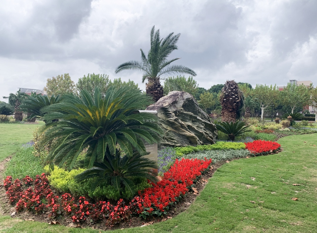位于宣怀大道南侧的“书山有路”泰山石景观是山东校友会为母校献上的一份生日礼物,寓意百廿春秋,桃李芬芳,也鼓励莘莘学子在求知道路上不断求索、开拓创新、勇攀高峰。本次改造以片植的形式围合区块,形成植物绿带,将原本零散分布的苏铁和加拿利海枣串联起来,增强了景观的整体性。花境植物则精心挑选了芬芳而又热烈、低矮又含蓄的品种,如一串红、四季海棠等,与不远处致远湖南岸火红的美人蕉、高雅的姜荷花遥相呼应,风姿绰约,旖旎绚烂。