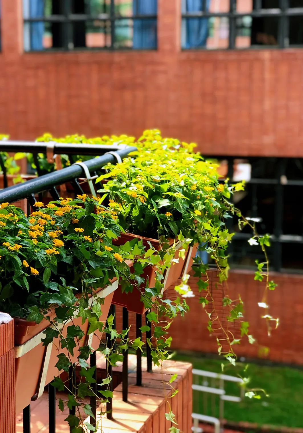 各层平台和通道沿边、楼梯转角的金属栏杆、弯弯折折的风雨连廊东侧……在细微可触的地方,以放置或悬挂的方式,构建了一个充满生机和活力的立体植物生态系统。无论是课间小憩,还是匆匆穿行,有花香与绿影相伴,心境也会变得明媚而愉悦。在植物选择上注重色彩和形态的搭配,既有直立的变叶木、西洋杜鹃、山桃草,也有垂挂的常春藤、金叶薯,色彩明暗协调,姿态刚柔并济。