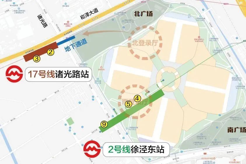 观众可根据场馆的标识指引到达北广场西北角,通过过街地道前往17号线诸光路站。