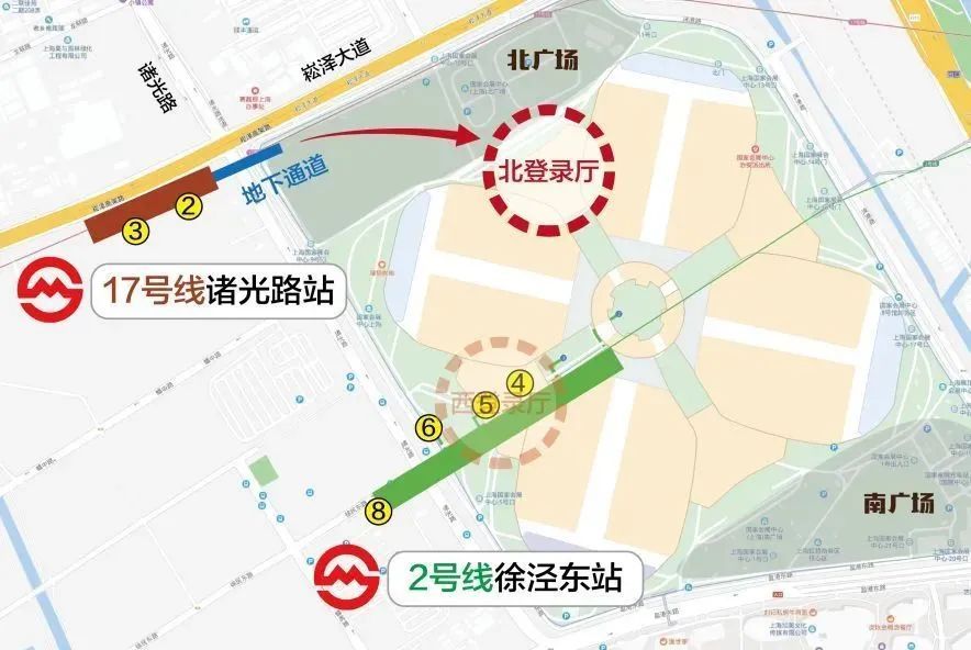 观众到达徐泾东站后,从4、5、6、8号口出站至场馆西登录厅入场(持进博会参展证人员可从4、5号口出站)。