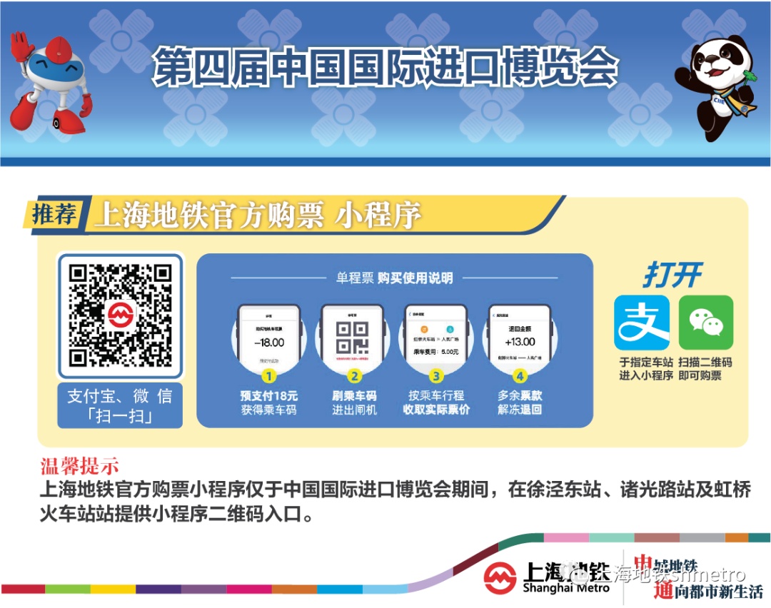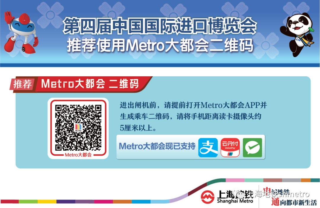 同时,为避免观展乘客集中离场后排队购票,展会期间,建议参展乘客在进站前购买好返程车票、一日票或优先下载“Metro大都会”APP直接刷二维码乘坐上海地铁。