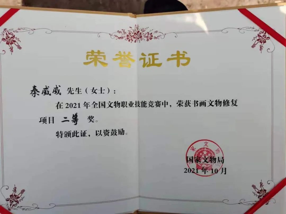近日,在由国家文物局主办,山东省文物局承办,以“保护文化遗产 弘扬工匠精神”为主题的2021年全国文物职业技能竞赛中,奉贤区非遗代表性项目“书画修复技艺”传承人秦威威脱颖而出,获得书画文物修复二等奖第一名(一等奖空缺)。竞赛分为古建筑木作、古建筑瓦作、古建筑彩画作、瓷器文物修复、考古勘探和书画文物修复6个项目。