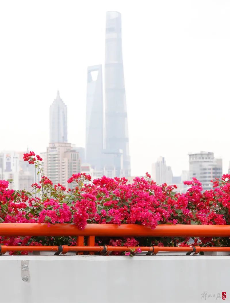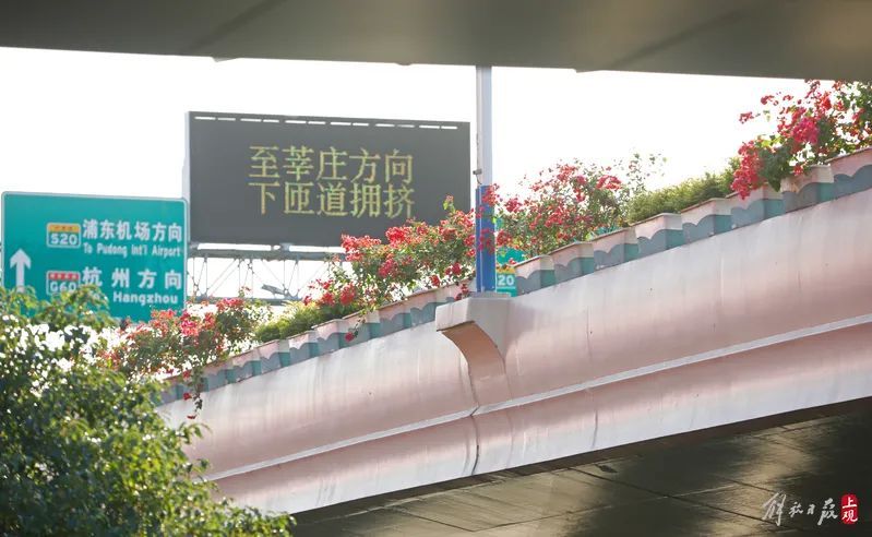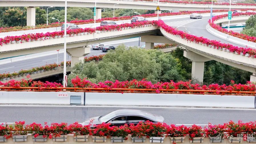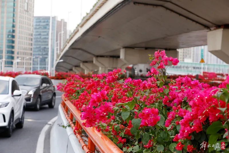 申城“申”字形高架道路中心地带、延安东路立交桥(延安高架路与南北高架路立交桥处),高架道路护栏上火红的三角梅,营造出“花开盛世”的和悦氛围。